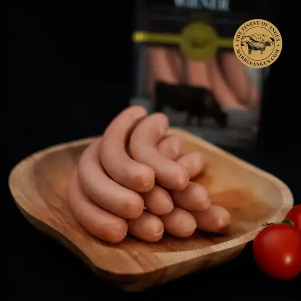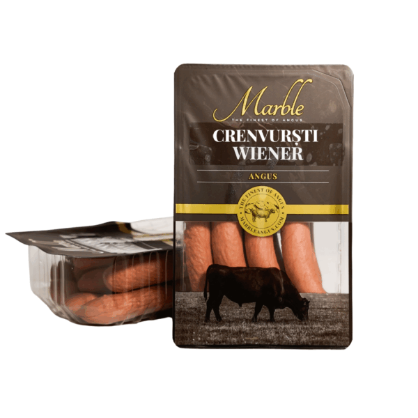 Crenvurștii Wiener sunt o alegere perfectă pentru iubitorii de preparate din carne de calitate superioară, combinați cu tradiția și rafinamentul rețetelor vieneze. Realizați din carne de vită Black Angus și slănină, acești crenvurști fierti și afumați sunt un deliciu culinar cu o aromă bogată și o textură delicată, perfectă pentru mesele zilnice sau ocazii speciale. Usturoiul, piperul și muștarul sunt ingredientele care aduc un plus de savoare, procesul de afumare adaugă o notă subtilă și bogată de fum natural, care completează perfect gustul cărnii de vită și al slăninii.